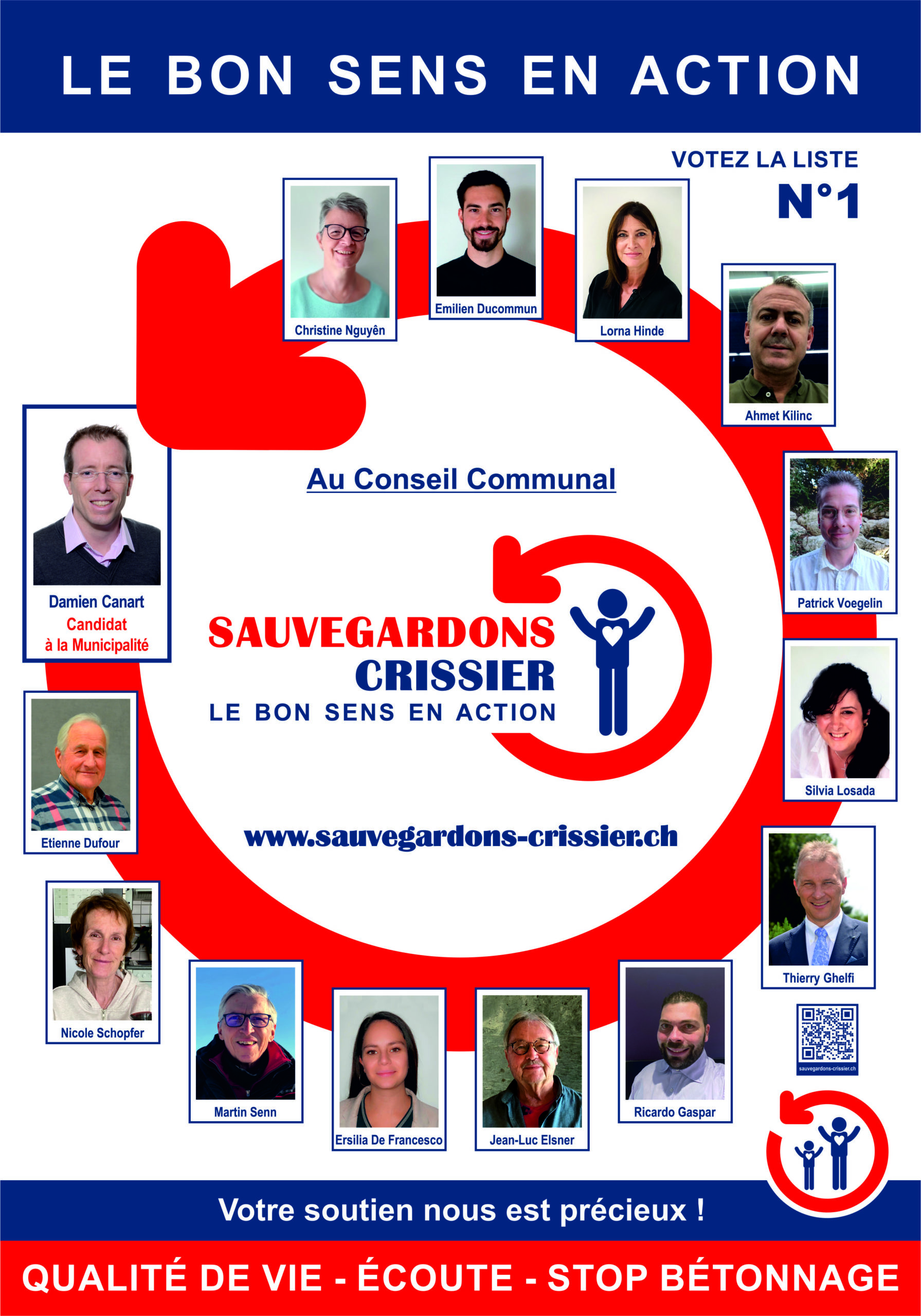 Votre voix est essentielle pour préserver la qualité de vie et l’avenir de Crissier. Ne manquez pas cette occasion de faire entendre votre opinion ! Un grand merci pour votre soutien ! Sauvegardons Crissier: le bon sens en action !